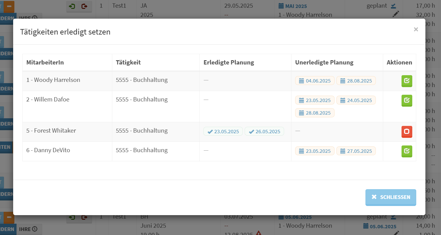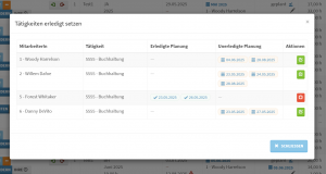 Das erledigt-Setzen in Unterlagen wurde überarbeitet. Beim Klicken auf das erledigt-Symbol bei BH und LV öffnet sich nun ein Fenster das für jede Kombination aus Mitarbeiter und Tätigkeit anzeigt an welchen Tagen die Planung schon erledigt und noch offen ist. So können sich einzelne Bereiche pro Mitarbeiter gesondert auf erledigt oder nicht erledigt gesetzt werden.